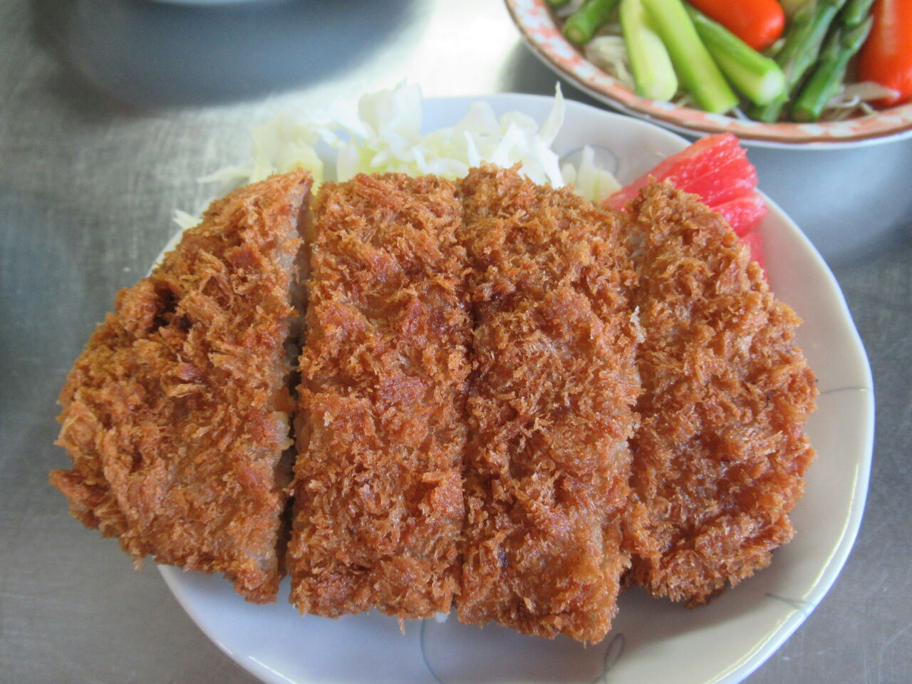 トンカツは揚げるだけの冷凍食品ですが、それでも揚げたてはおいしいものです。千切りキャベツとグレープフルーツを添えています。
