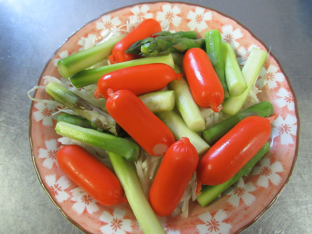 これは万年ダイエットの社長のトンカツの代わりの代替品です。千切りキャベツ、アスパラ、赤ウインナーを盛り付けレンチンして食べてもらいます。