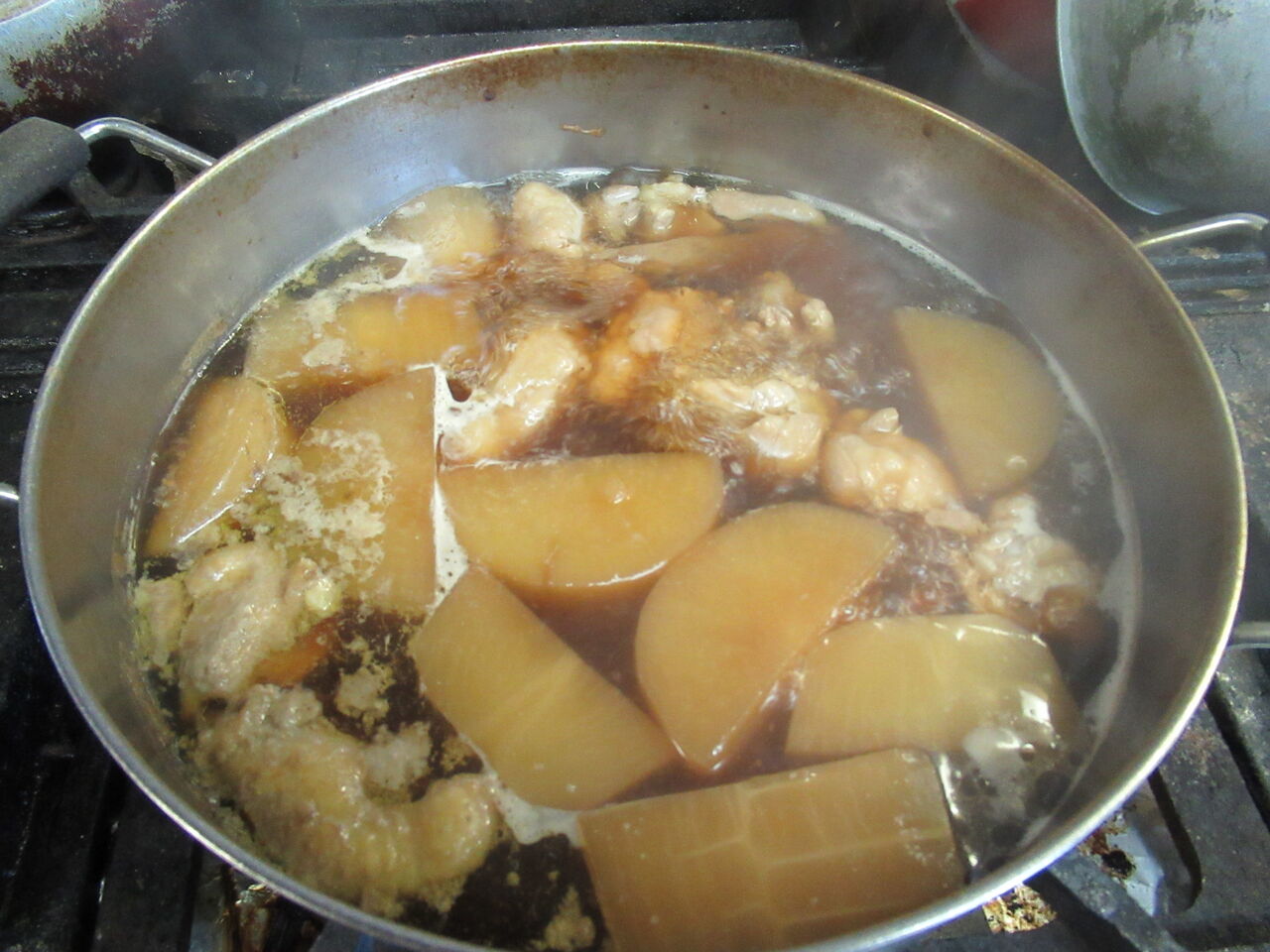 実はこの源助大根(加賀野菜)ホームページ用のオリジナル料理としてチョイスしたのですが、一本は多いので残った分を起用のおかずにしました。なのでこれで二日続けて煮込んでいます。