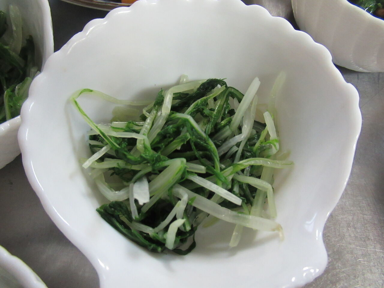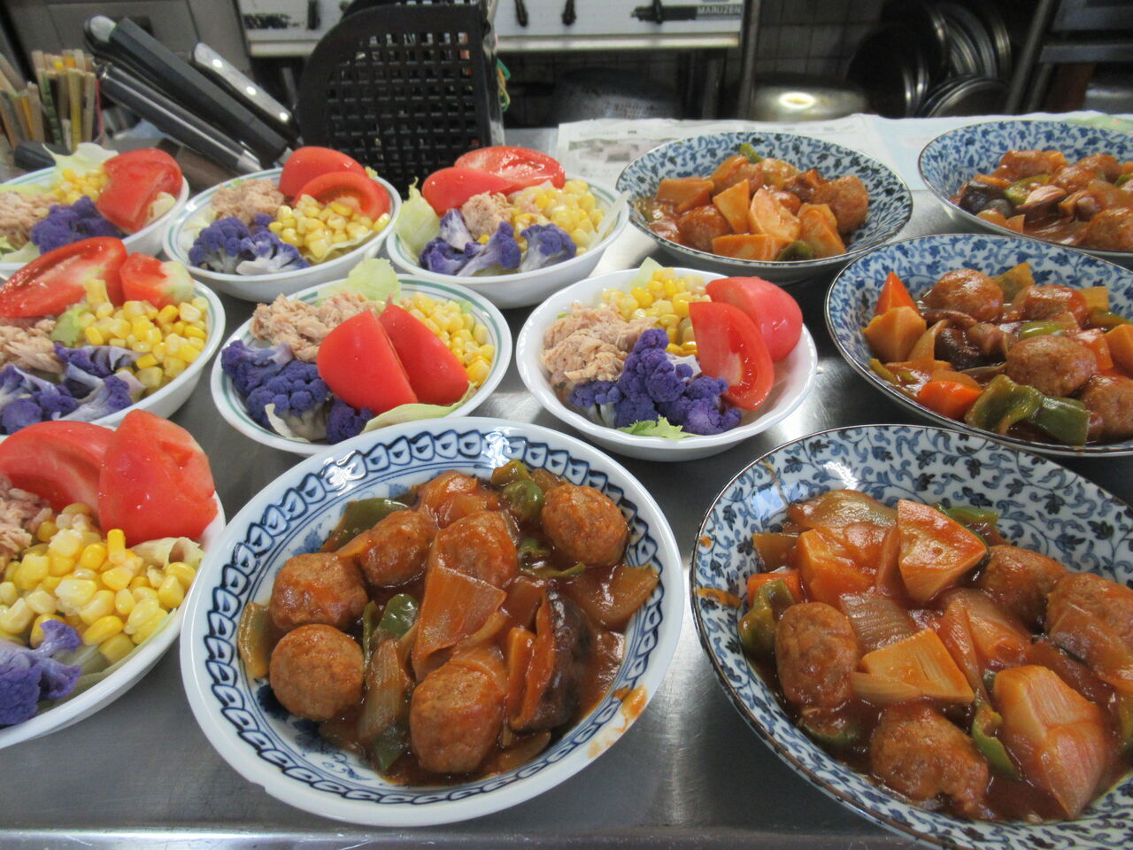 今日のカウンター上です。右には酢豚風のお代わり用が、左には水菜のおひたしがお代わり用に用意されています。本当は蕪の葉の納豆和えも出ていたのですが皆に食べられたようです。