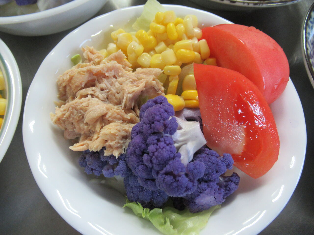 どぎつい色のカリフラワーを渡されたので今日はサラダにしました。レタス、ツナ、コーン、トマトで作ってあります。レタスの代わりに千切りキャベツのものもあります。