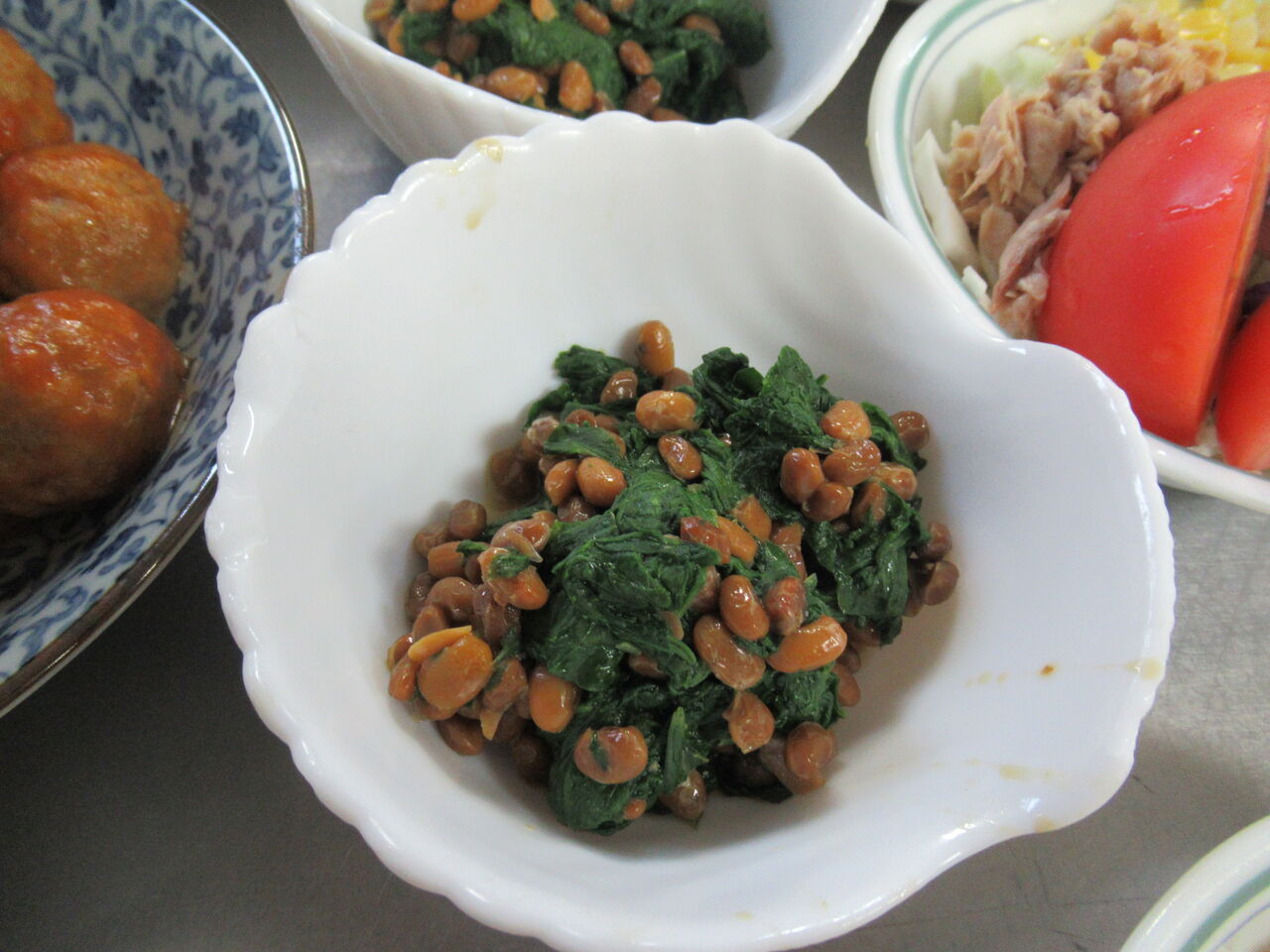 10月4日金曜日、今日のお昼御飯です。主菜は「肉団子の酢豚風」副菜は「紫カリフラワーのサラダ」「水菜のおひたし」「蕪の葉の納豆和え」のどれかです。汁物は「なめこ汁」になりました。