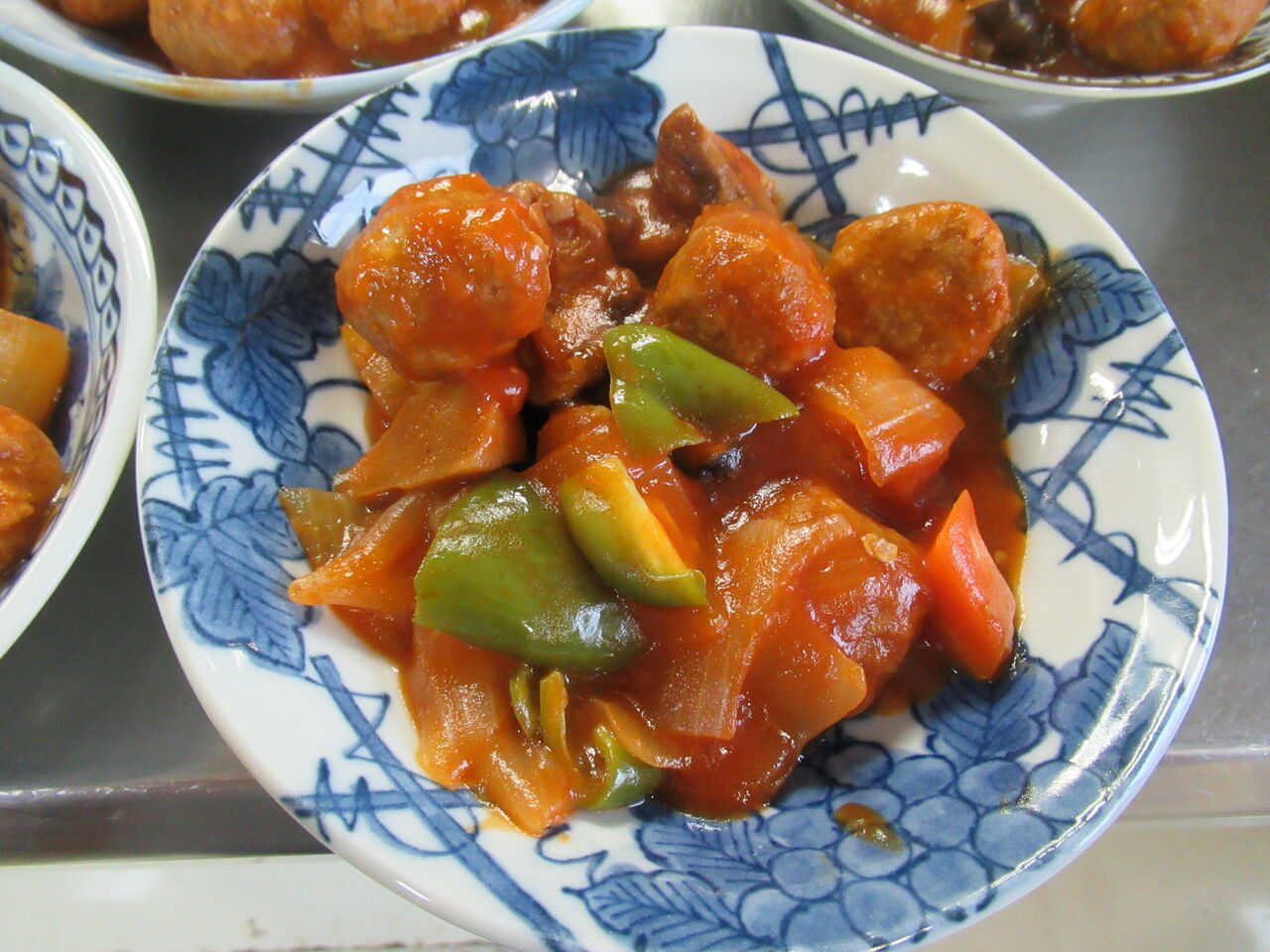 干しシイタケ、筍、人参、玉ねぎ、肉団子、ピーマンで作った酢豚風です。柚子みつを砂糖と一緒に使いました。ピーマンの在庫整理のためのメニューです。