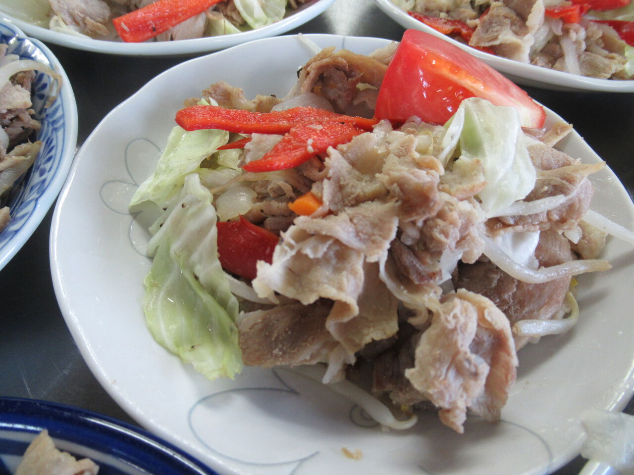 野菜炒めは豚小間とキャベツ、人参、玉ねぎ、もやし、ルミネ(赤ピーマン)で作りました。トマトを添えています。焼き肉のたれで食べることが当社の推奨です。