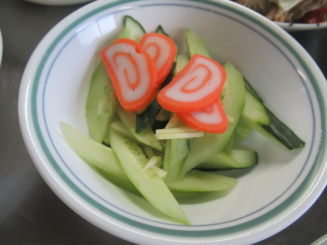 渡された胡瓜を刻み千切りショウガを混ぜ込み、薄切りにした赤巻きハベン飾りました。