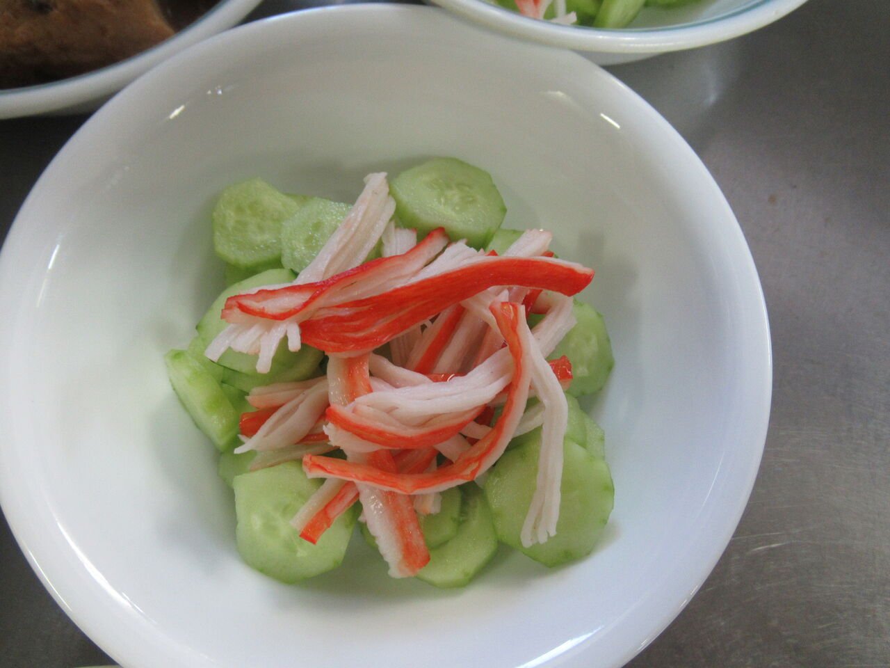 渡された胡瓜の皮をむいて輪切りにしカニ足かまぼこを裂いて飾りました。