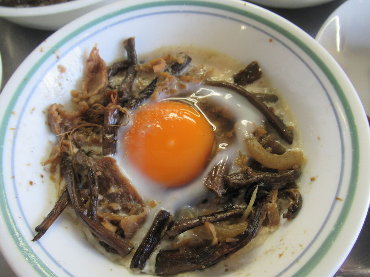 ゼンマイと突きこんにゃく、豚小間の煮物に卵を割り入れレンチンして副菜にしました。