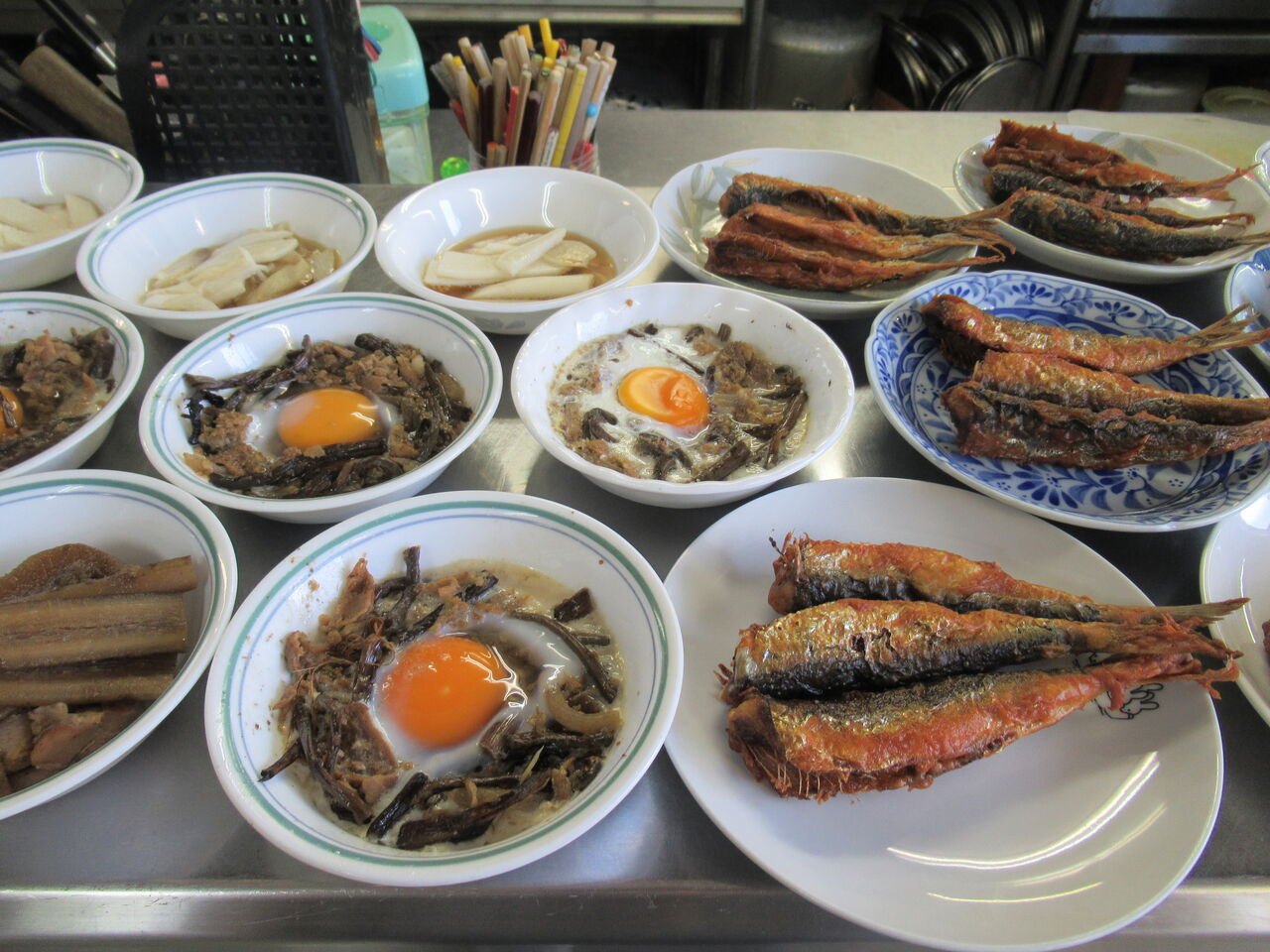 今日のカウンター上です。右にはから揚げのお代わり用と南蛮漬けが、左にはゼンマイと生揚げの煮物がお代わり用に出ています。