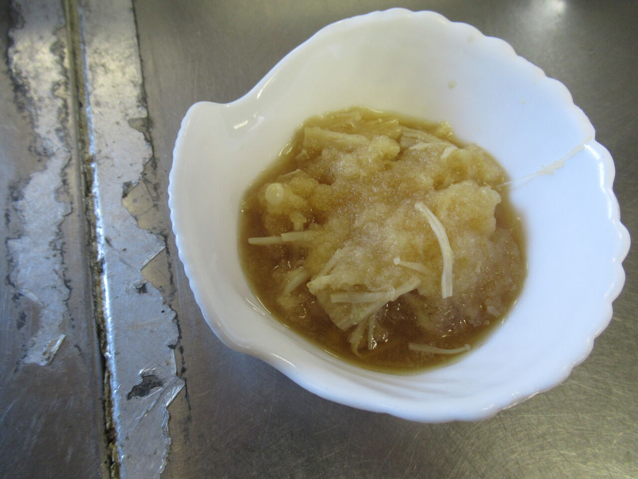 昨日作った大根おろしに今日は茹でたエノキを加え追いガツオつゆで味付けしました。