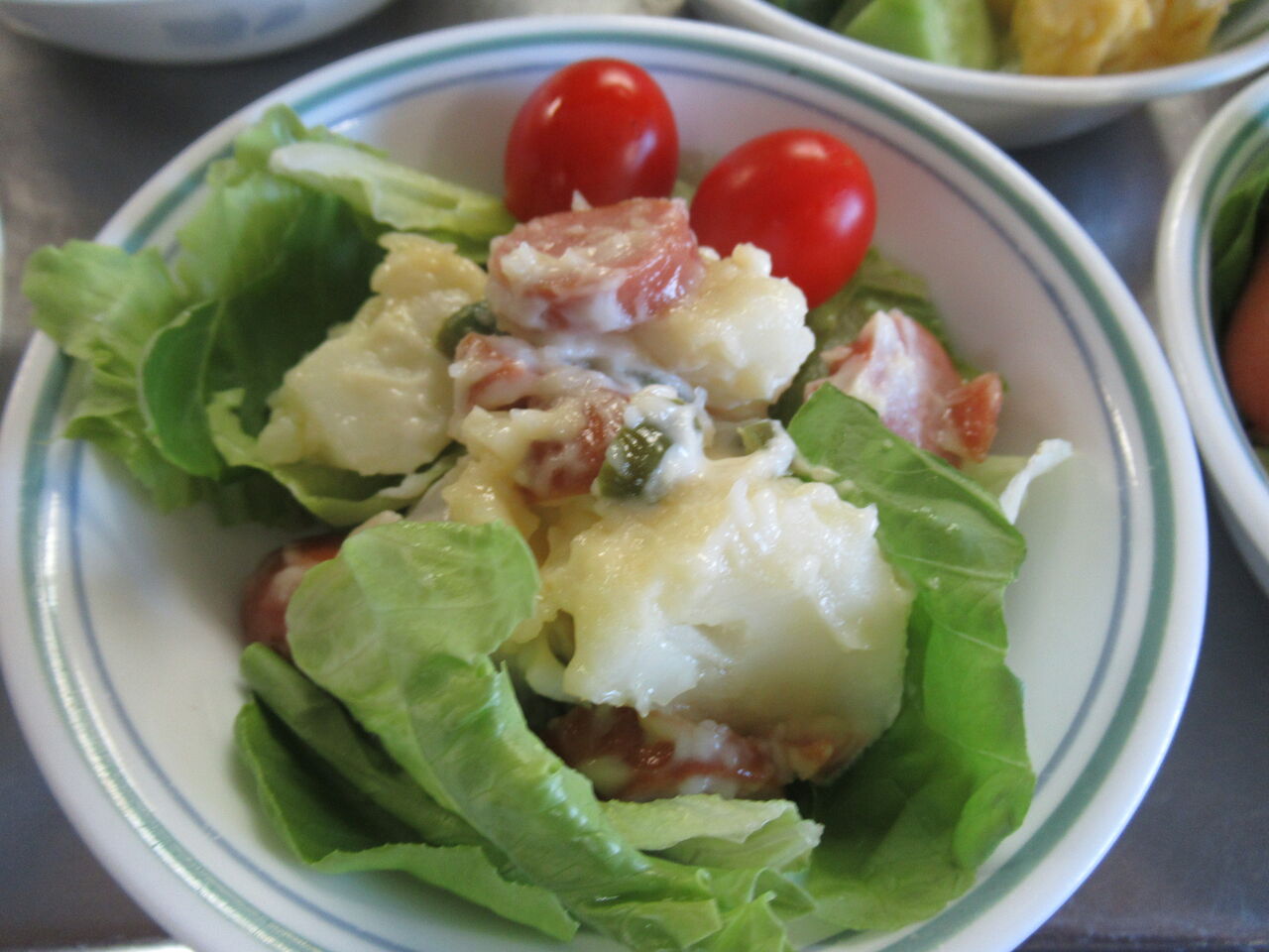 先日のこふき芋のサラダでポテサラを作りました。レタスの上に盛り付けミニトマトを添えています。