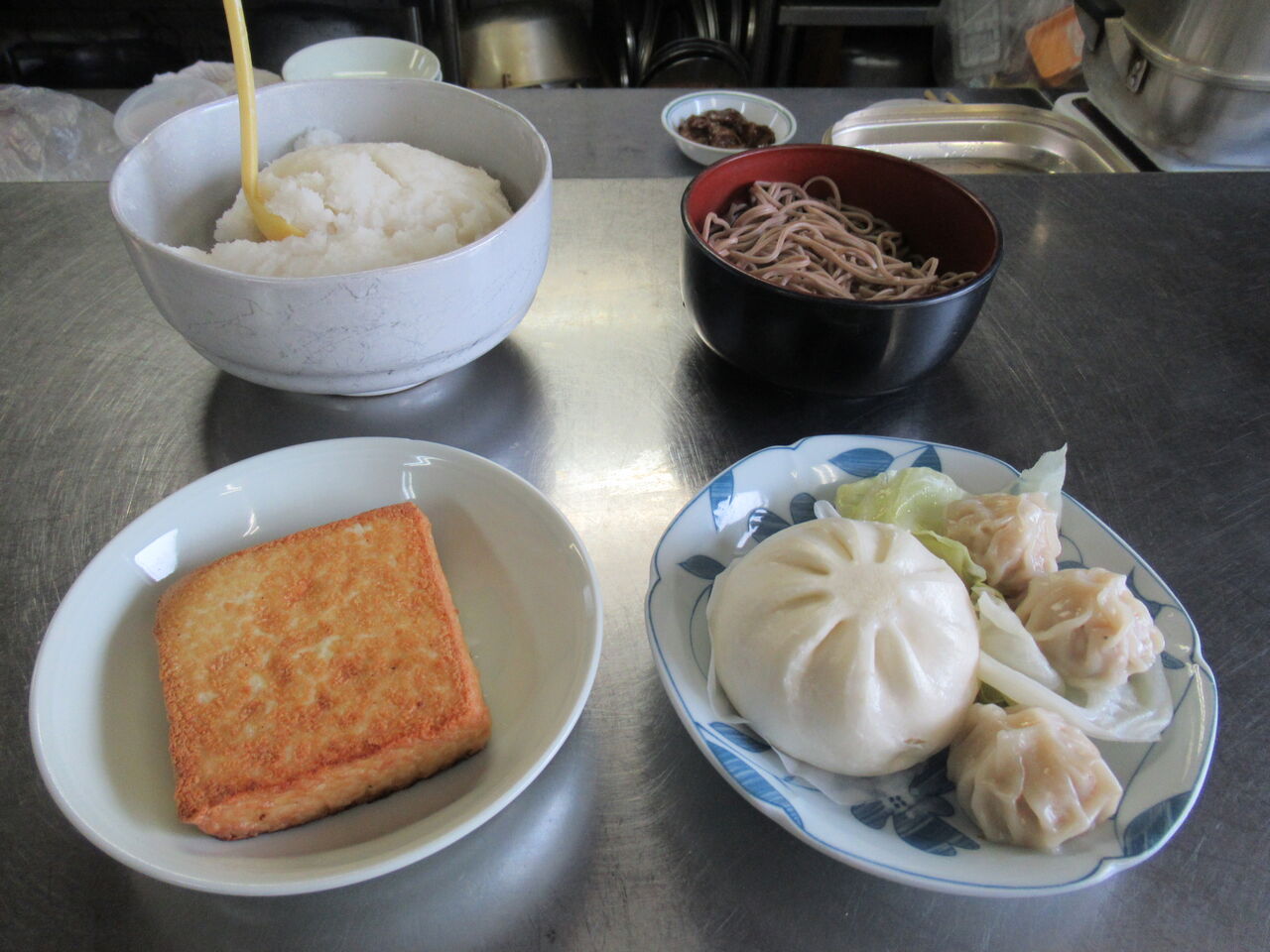 11月24日日曜日、今日のお昼御飯です。休日バージョンのお昼御飯は「肉まんとシュウマイ」「焼き生揚げ」です。麺は温かい蕎麦にしました。
