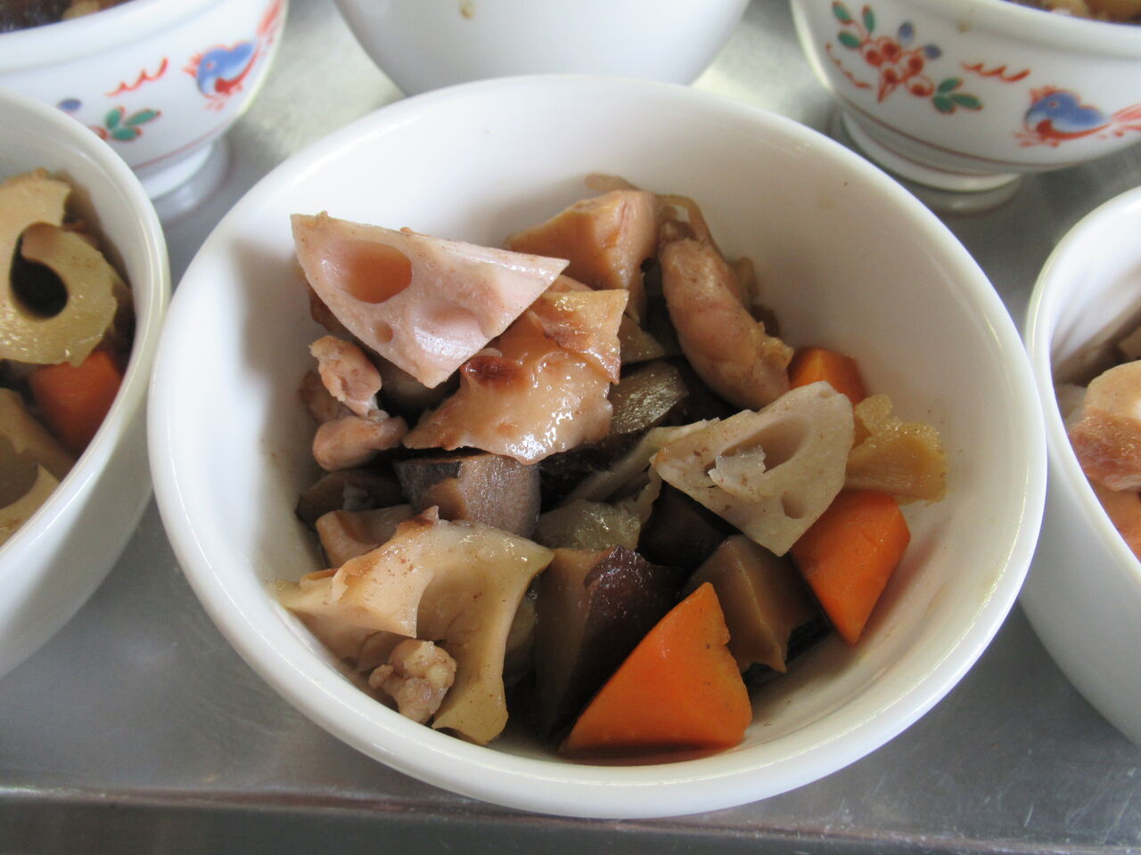 筑前煮はこんにゃく、干しシイタケ、人参、蓮根、鶏もも肉、竹輪、ゴボウ、こんにゃく、筍で作っています。