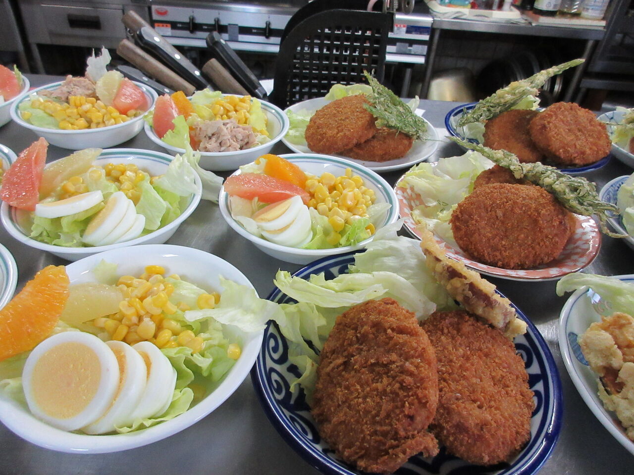 今日のカウンター上です。右にはコロッケや揚げ物のお代わりが出ており左にはスパゲティがお代わり用になっています。