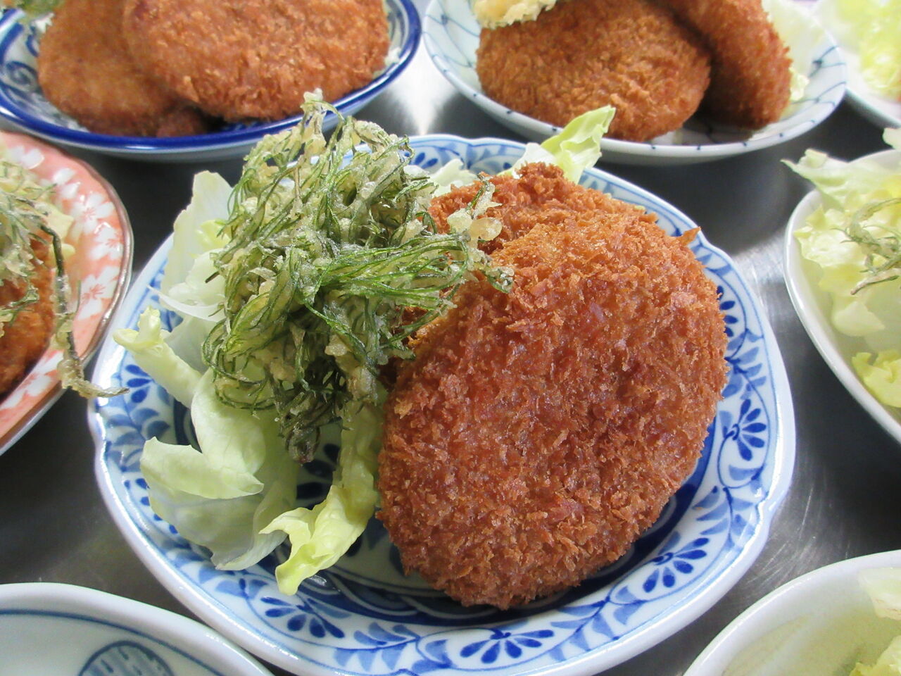 コロッケにレタスとフェンネルのかき揚げが添えてあります。