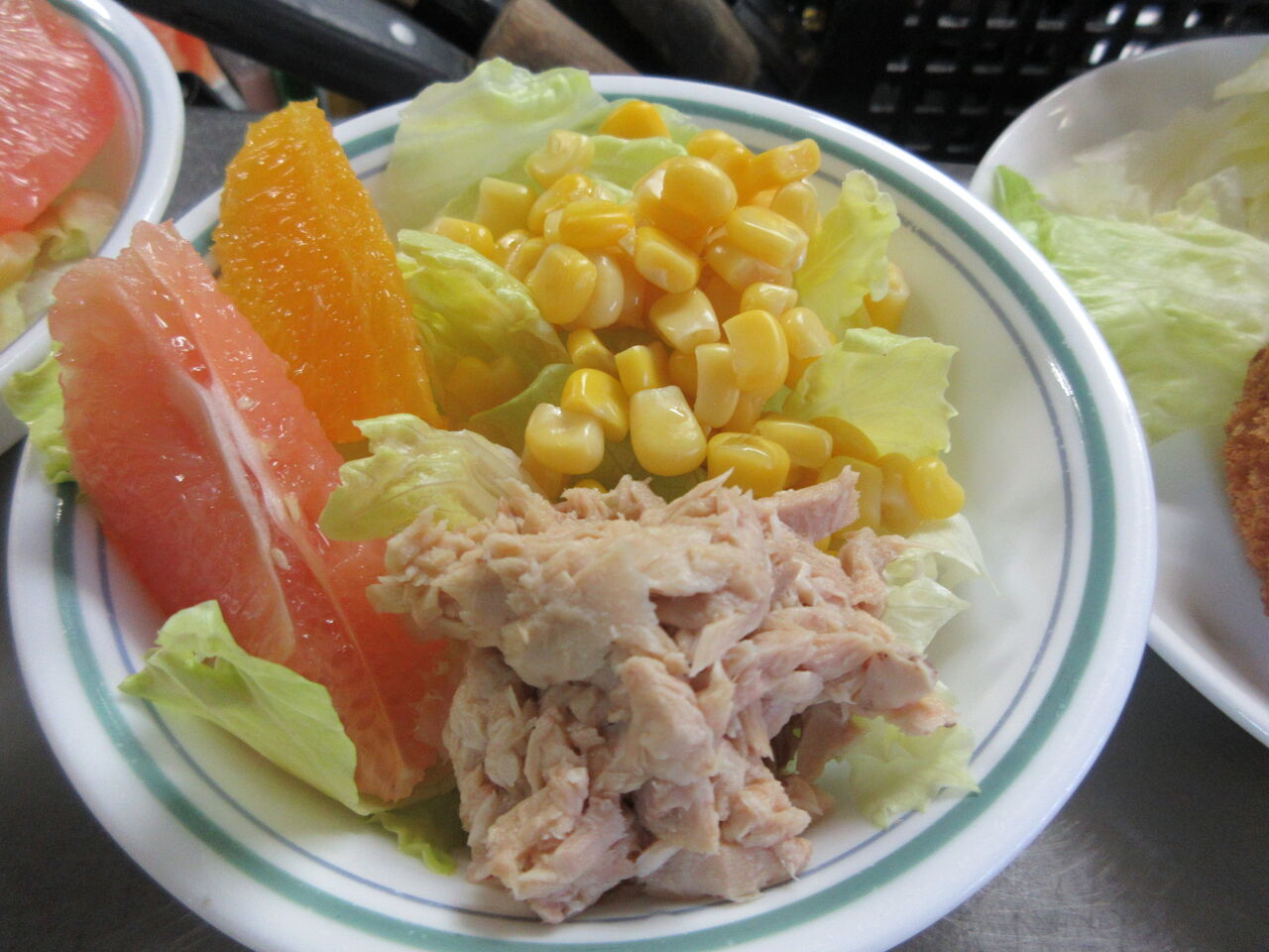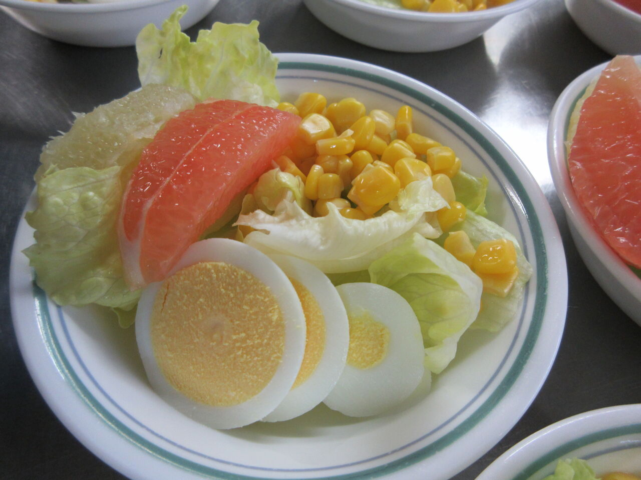 レタス、茹で卵、コーン、グレープフルーツのサラダです。
