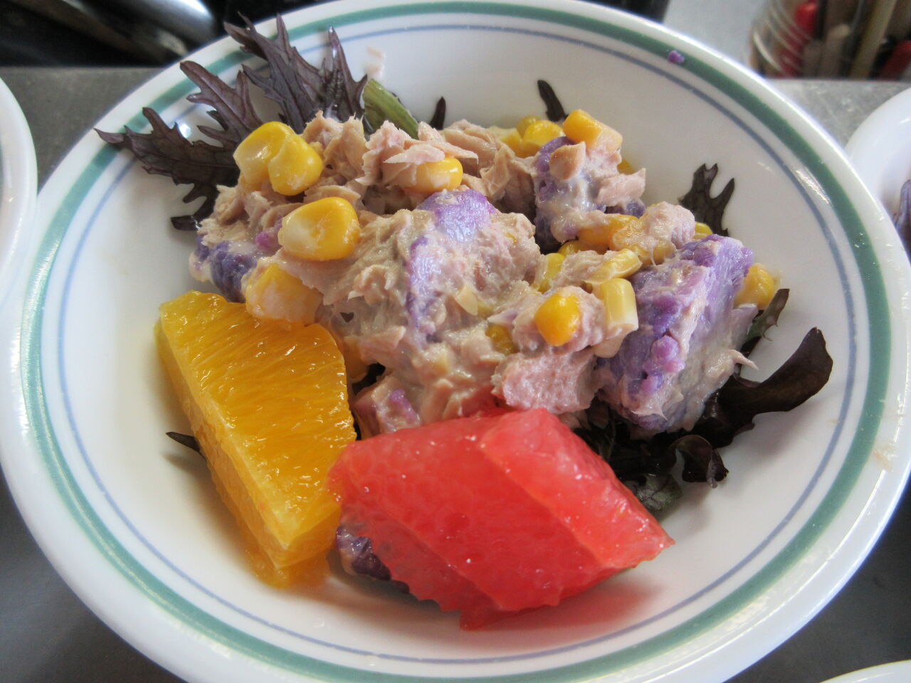 クリスピーレッドとサラダからし菜の葉先をレタス代わりに敷き、茹でた紫カリフラワーにツナとコーンを加えマヨネーズで和えたものを盛りつけフルーツかトマトなどを飾りました。