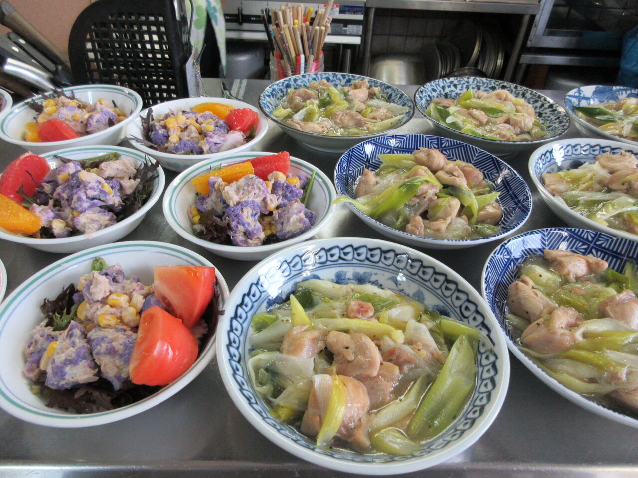 1月31日金曜日、今日のお昼御飯です。主菜は「鶏もも肉と長ネギの塩コショウ炒め」副菜は「紫カリフラワーのツナサラダ」か「菜っ葉と厚揚げの煮物」です。汁物は「水菜と麩の味噌汁」になりました。