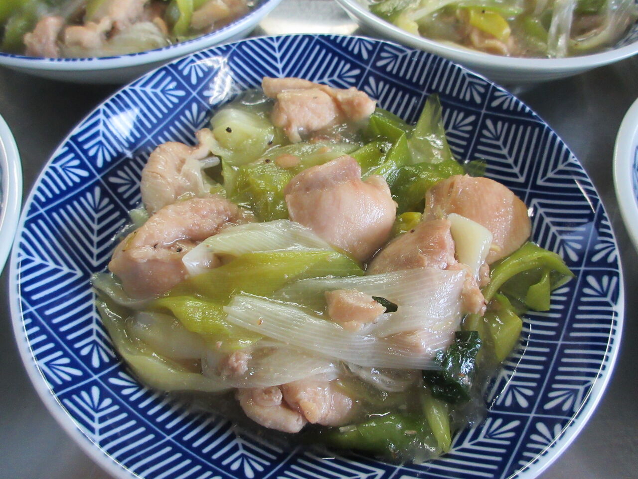 鶏もも肉と千切りショウガ、長ネギを炒めて塩コショウで味付けし、染み出た汁は片栗でとじてあります。