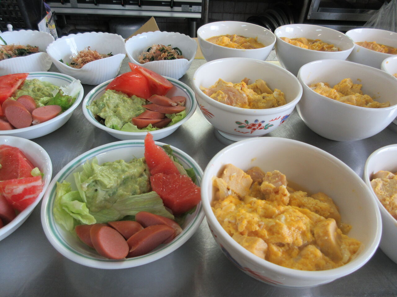 2月28日金曜日、今日のお昼御飯です。主菜は「高野豆腐の卵とじ」副菜は「アボカドのサラダ」「長いもとろろ」「春菊のおひたし」のどれかです。汁物は「若竹汁」になりました。生筍の切れはしを使って筍ご飯も作ってあります。