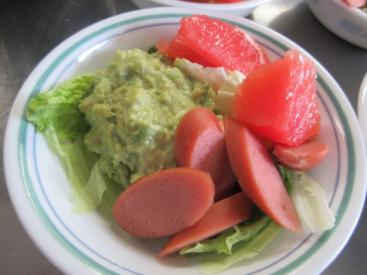 渡されたアボカドをつぶしワサビとマヨネーズを混ぜました。レタスを敷き刻んだソーセージとトマトかグレープフルーツを飾っています。