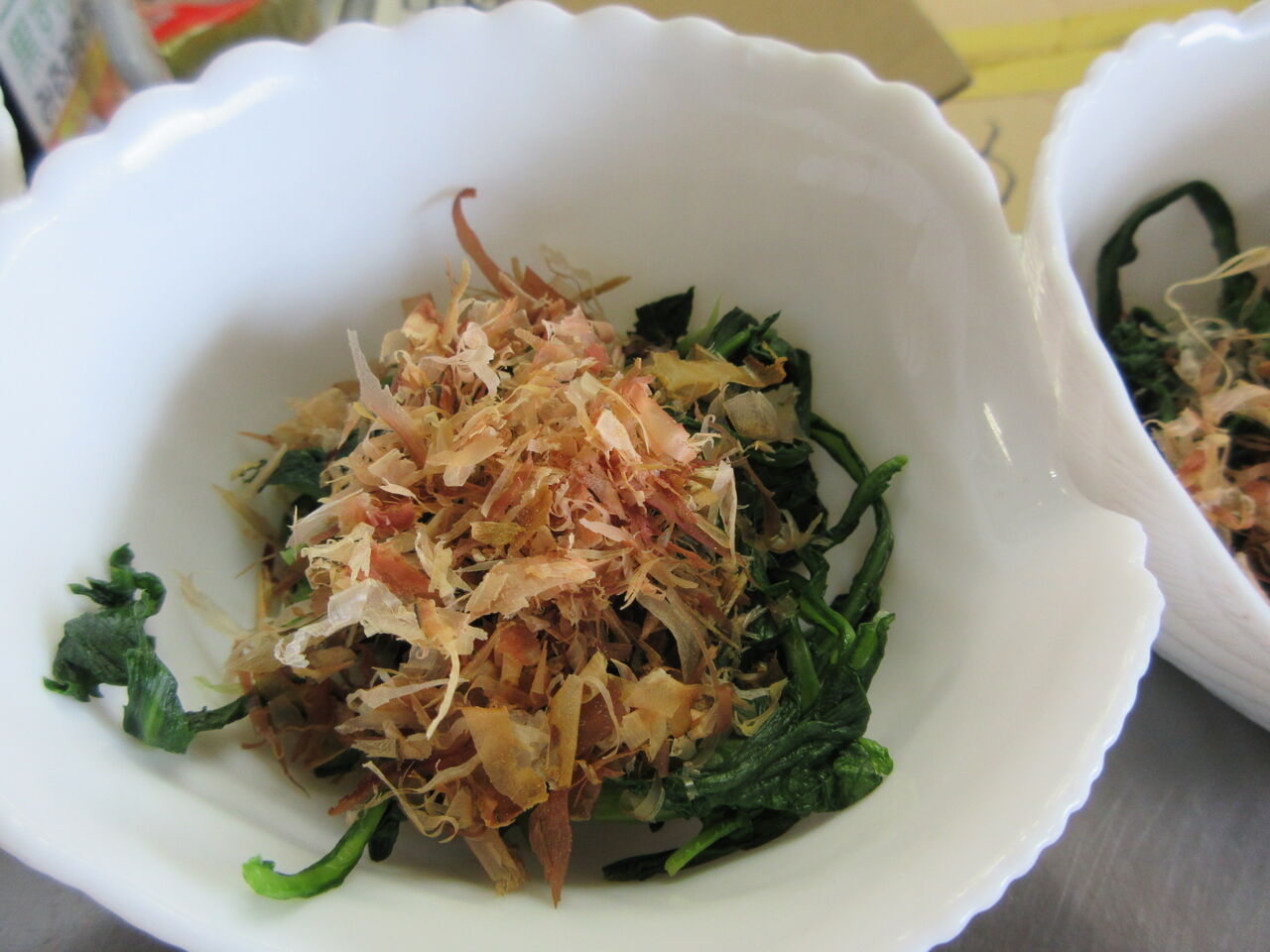 春菊のおひたしには花かつおかけています。
