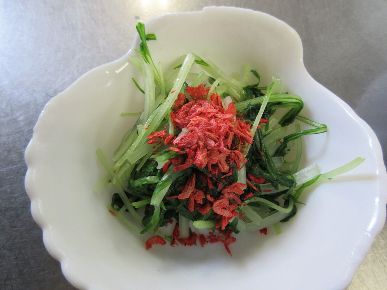 渡された水菜にプラスしておひたしを作りました。サクラエビトッピングしています。
