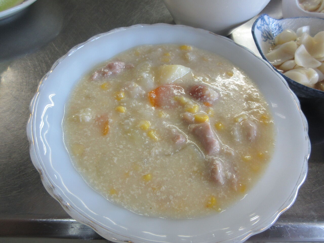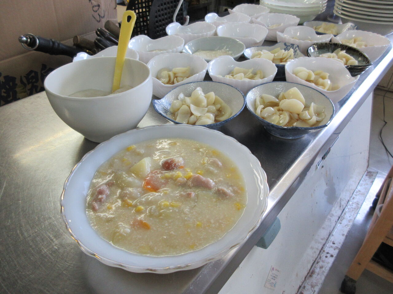 今日のカウンター上です。ホワイトシチューは加温プレートで温められています。副菜のとろろがお代わり用として出ています。