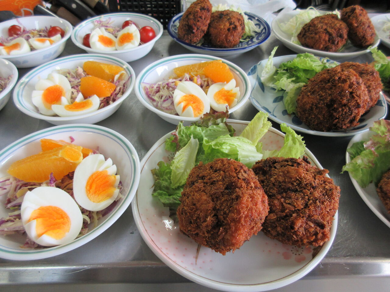 休み前に作ったキャベツのツナサラダがまだ残っていたので半熟の茹で卵を作って添えました。オレンジかミニトマト添えています。