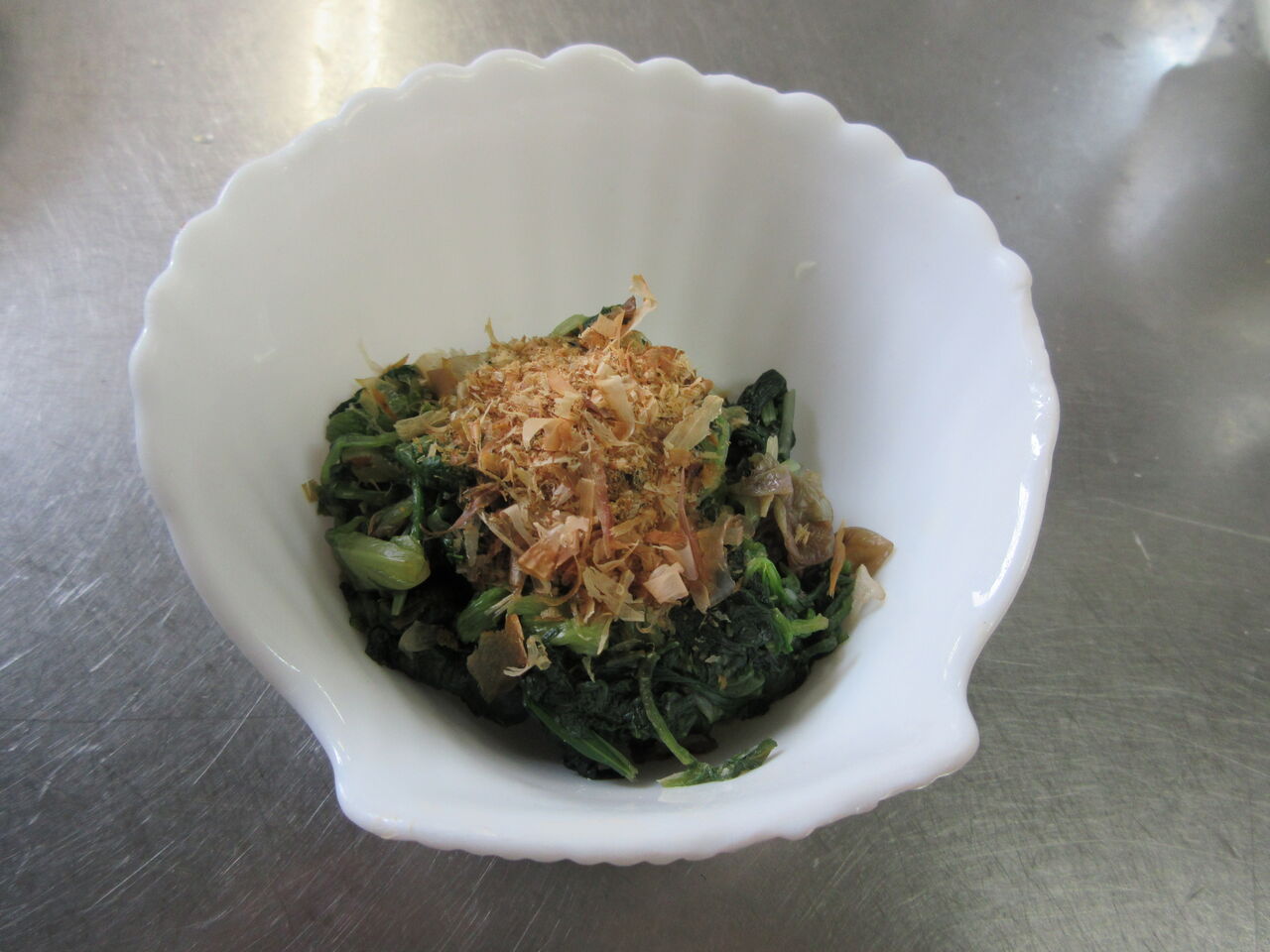 ベビーリーフのおひたしをツナ嫌いの人の副菜にしました。花かつおかけています。