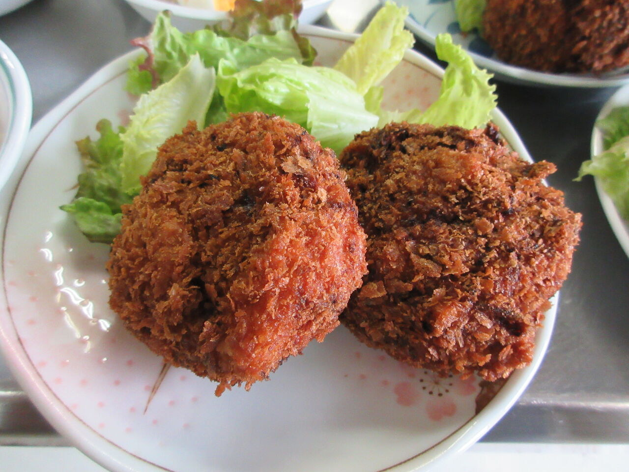 紫のキャベツと普通のキャベツを刻んだものを鶏ひき肉に混ぜ肉だねを作り、メンチカツを作りました。レタスか千切りキャベツを添えています。