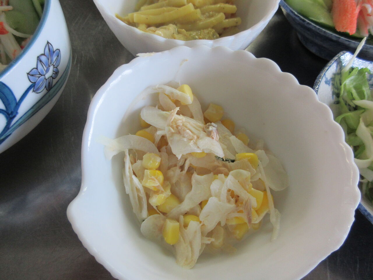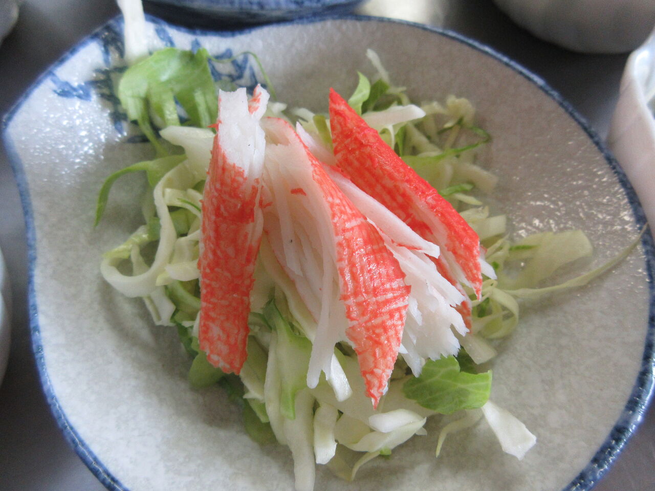 昨日刻んだキャベツに少しだけ昆布出しを混ぜて上にカニ足かまぼこを散らしました。