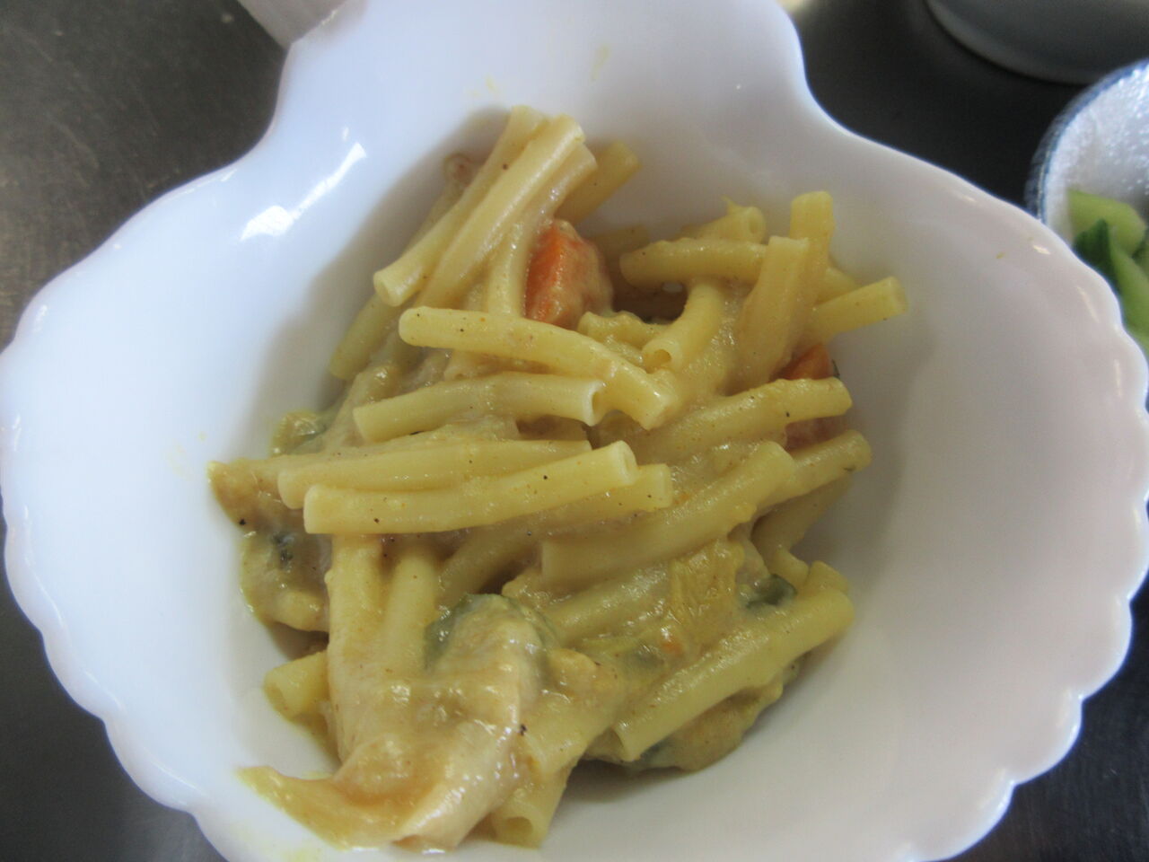 マカロニをゆで、残っていたカレーシチューを絡めました。