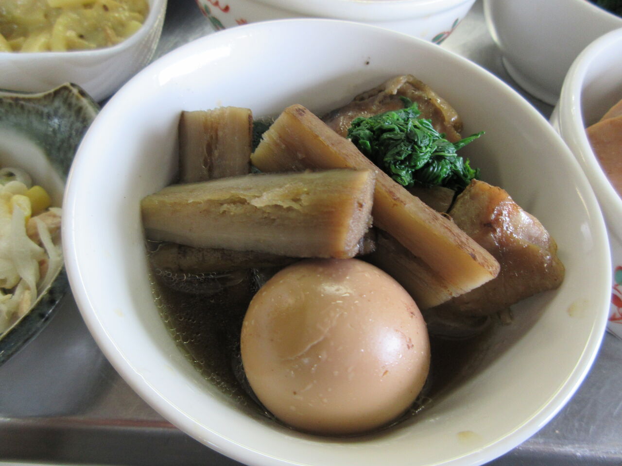 渡されていた太い大根を使って煮物にしました。卵と鶏もも肉、ゴボウを煮付け彩に茹でた蕪の葉を添えています。