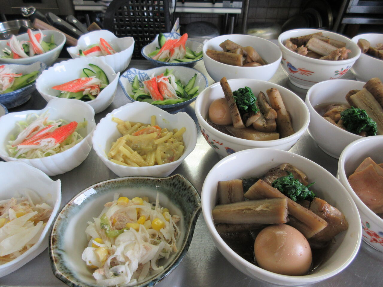 今日のカウンター上です。右には煮物の残りが加温プレートにのっています。左には胡瓜とカニ足が出ています。