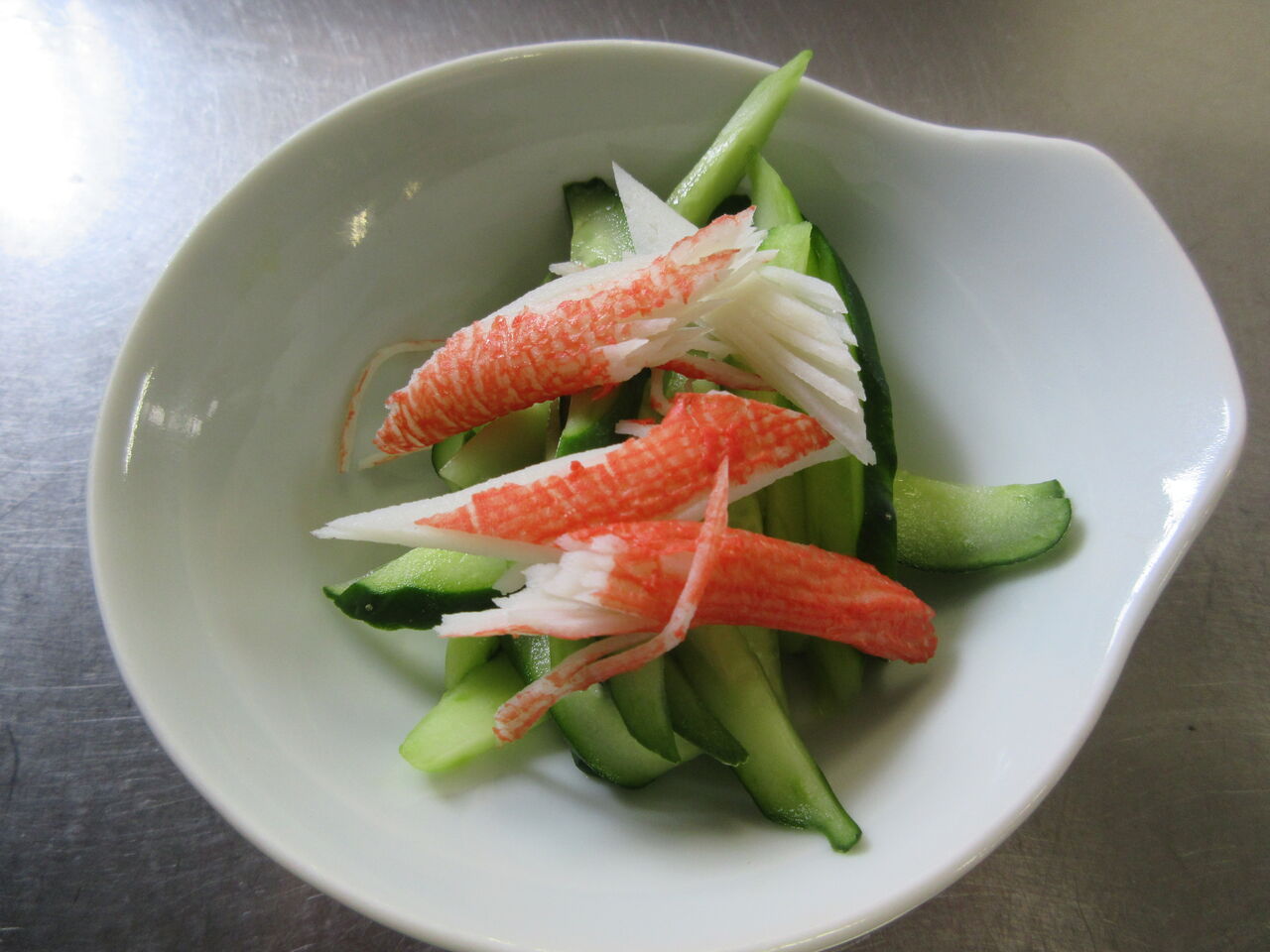 笹うち切りにした胡瓜に昆布出しをまぶしカニ足かまぼこを散らしています。