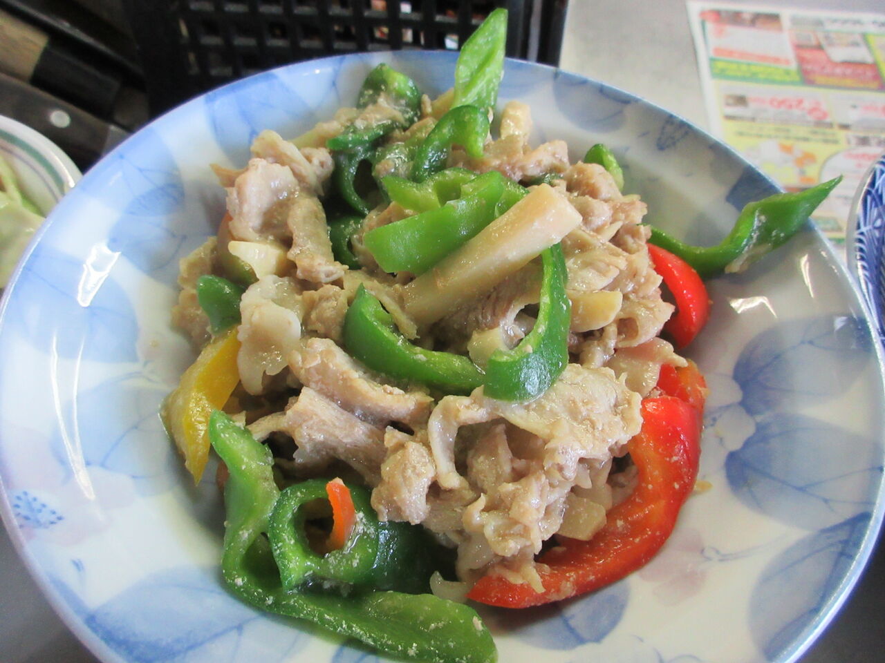 生筍の切れ端で青椒肉絲風炒め物を作りました。豚小間とピーマン、パプリカも使っています。