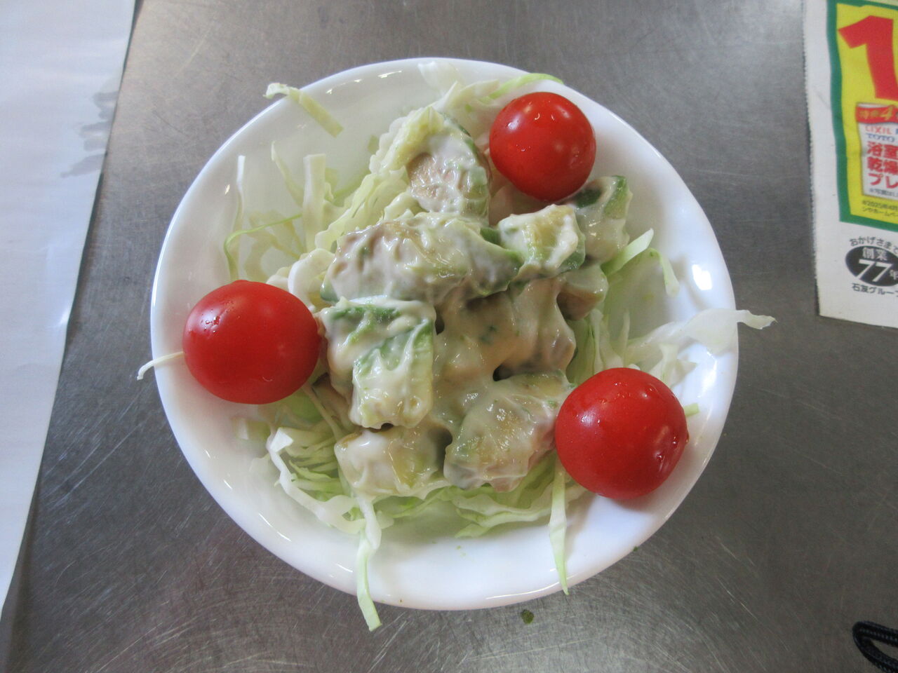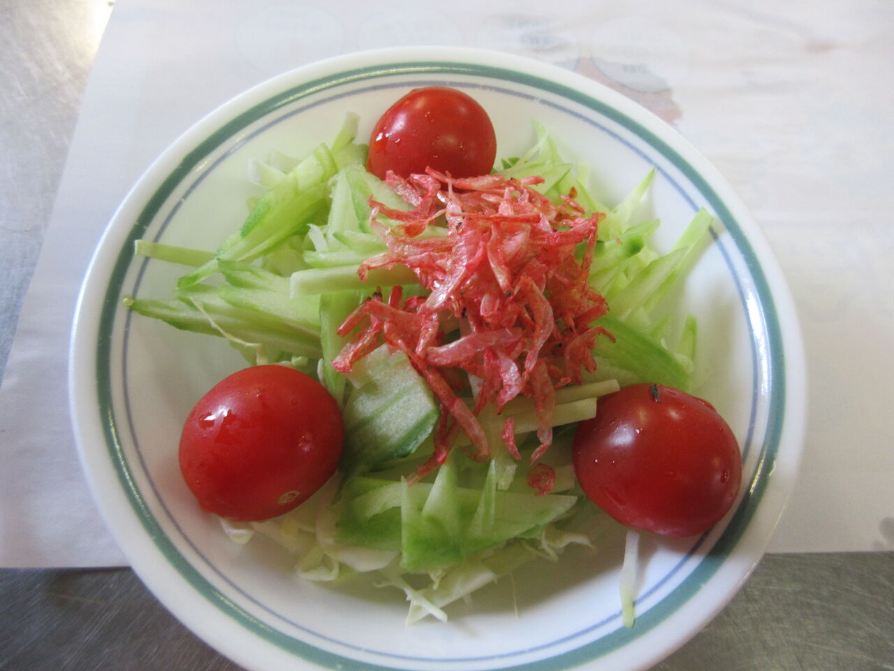 歯の悪い人には胡瓜の千切りとサクラエビでサラダを作りました。