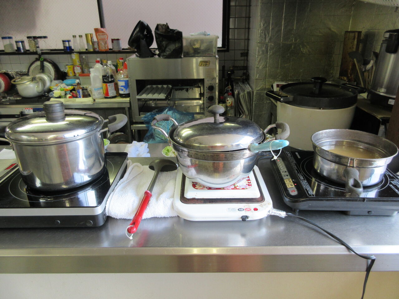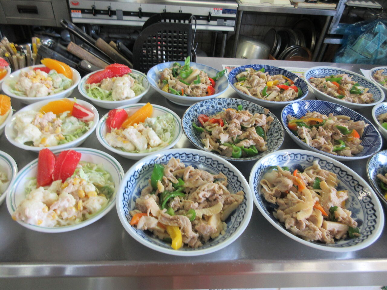今日のカウンター上です。右には炒め物のお代わり用が、左にはサラダのお代わり用が出ています。