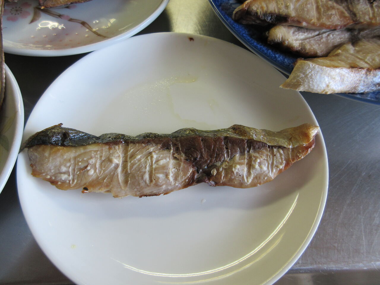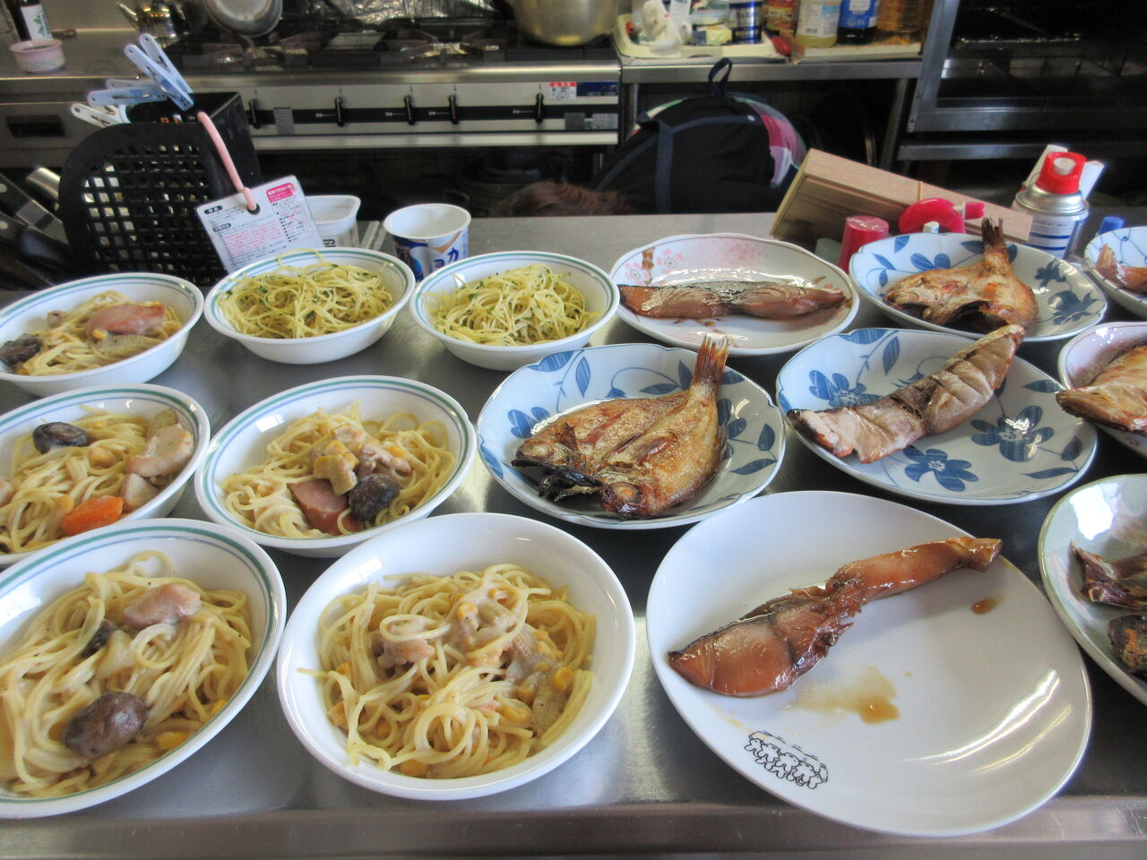 今日のカウンター上です。右には鰤の塩焼きがお代わり用として出してあり、横に大根おろしを入れた鉢が出ています。副菜のお代わり用はパセリスパゲティです。