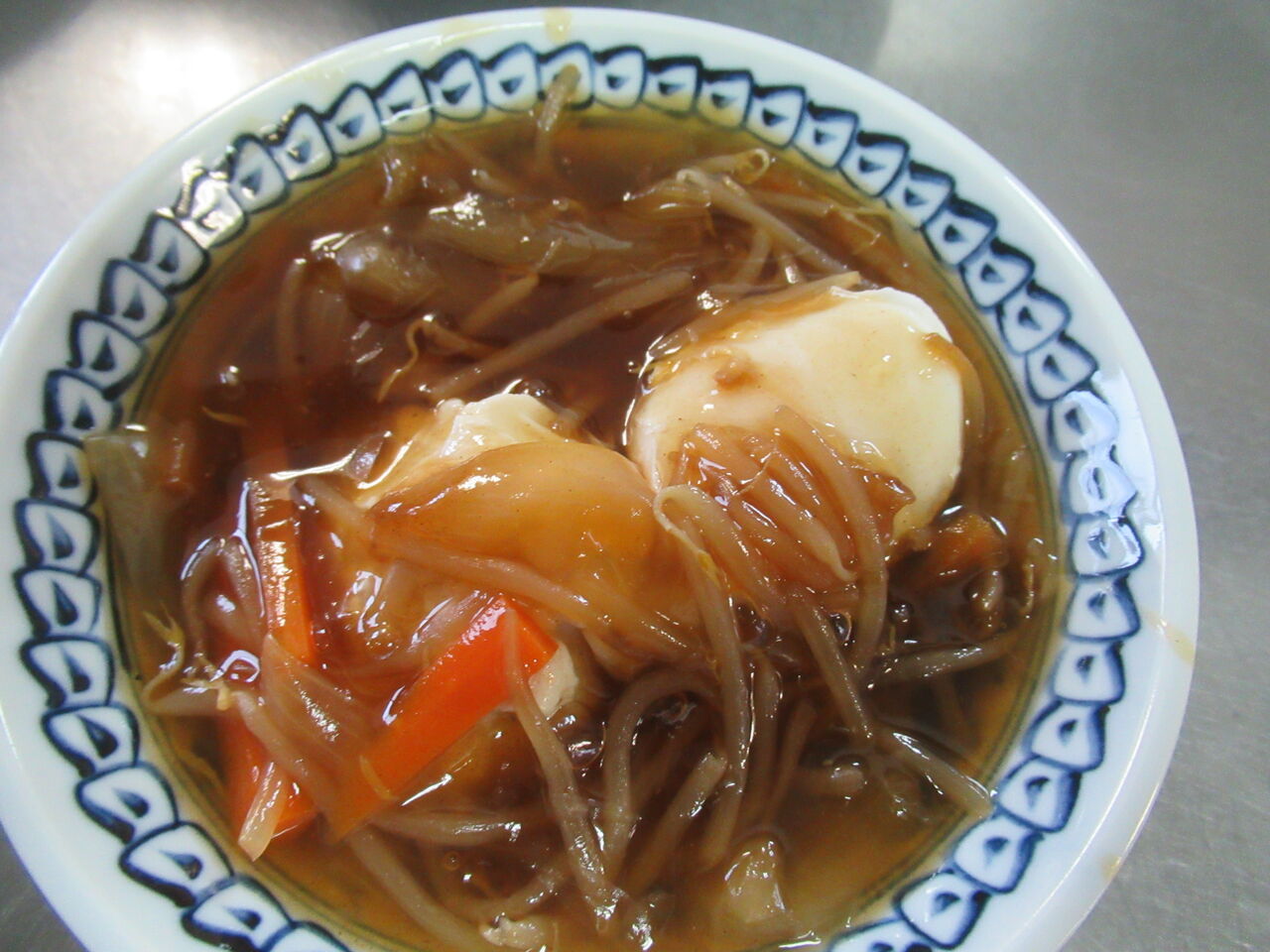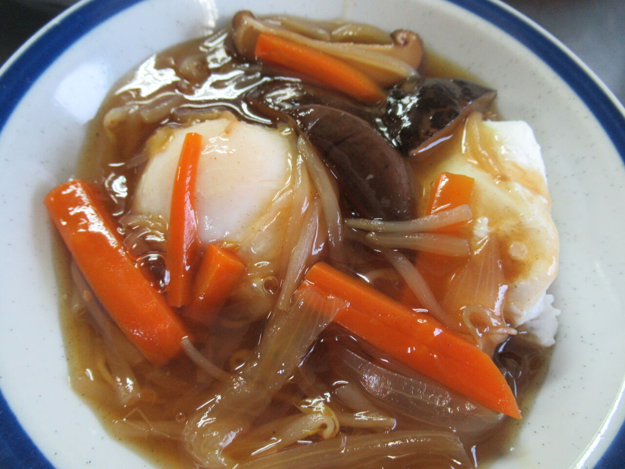 野菜あんはにんじん、玉ねぎ、干しシイタケ、もやしで作ってあります。これがスタンダードです。