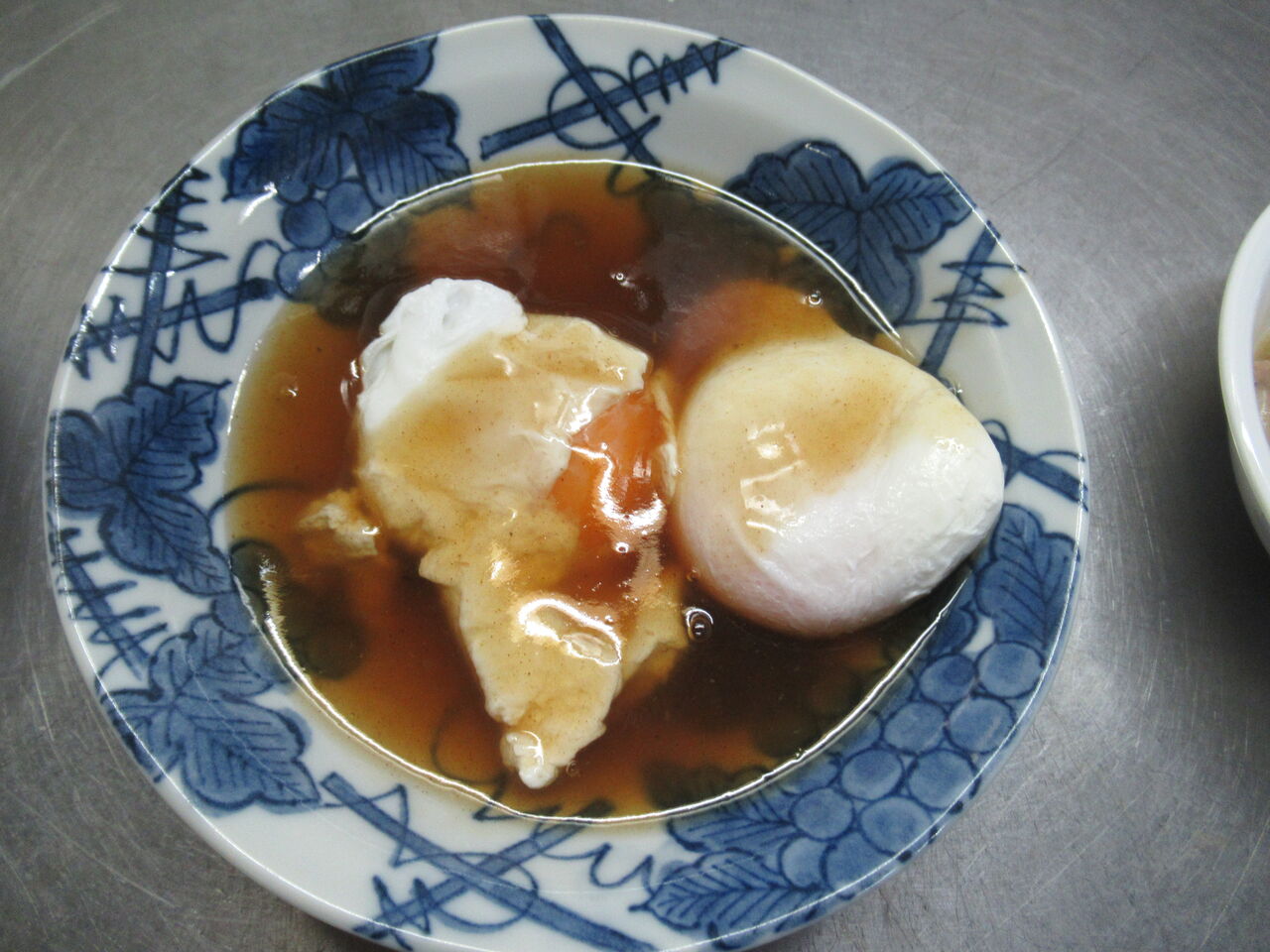 これが今日の食卓です。落とし卵のあんかけは手前2列は堅めの卵、後ろ1列はゆるめの卵です。