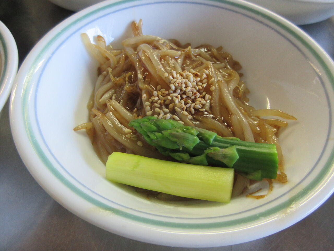 渡されたもやしを水洗いしてごま油で炒めオイスターソースで味付けしました。染み出た汁を片栗でとじています。茹でたアスパラを添えいりごまをトッピングしました。