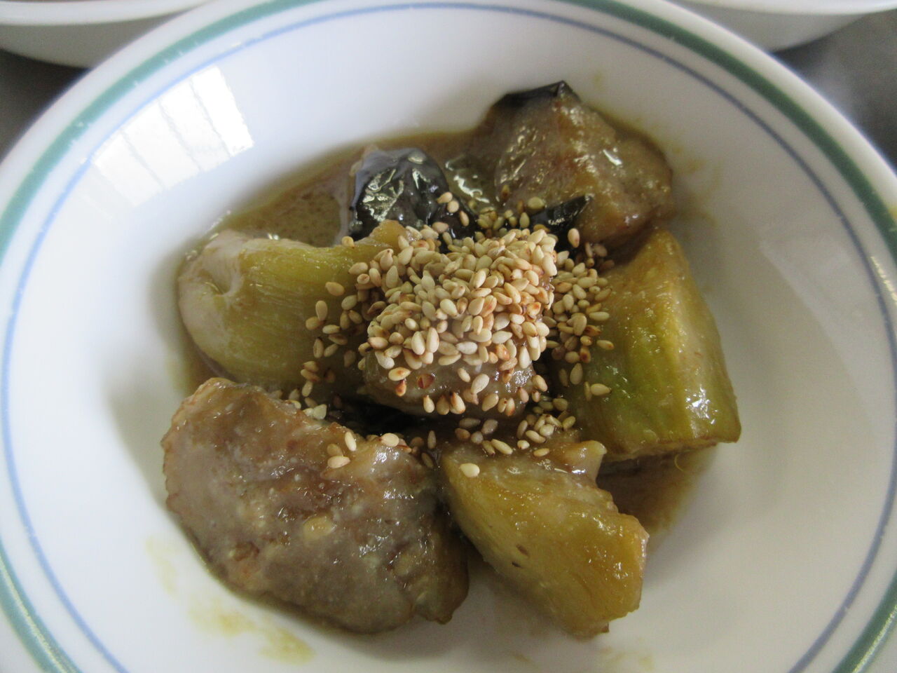 渡された皮の汚い長ナスを皮むきして乱切りにし、素揚げした後みそだれに絡ませました。
